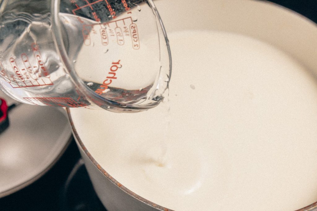 2. CURDLE. Once it reaches to temp, turn off heat, and stir in your vinegar for half a minute, it will curdle! Then put the lid on it, let it rest for 15 minutes.