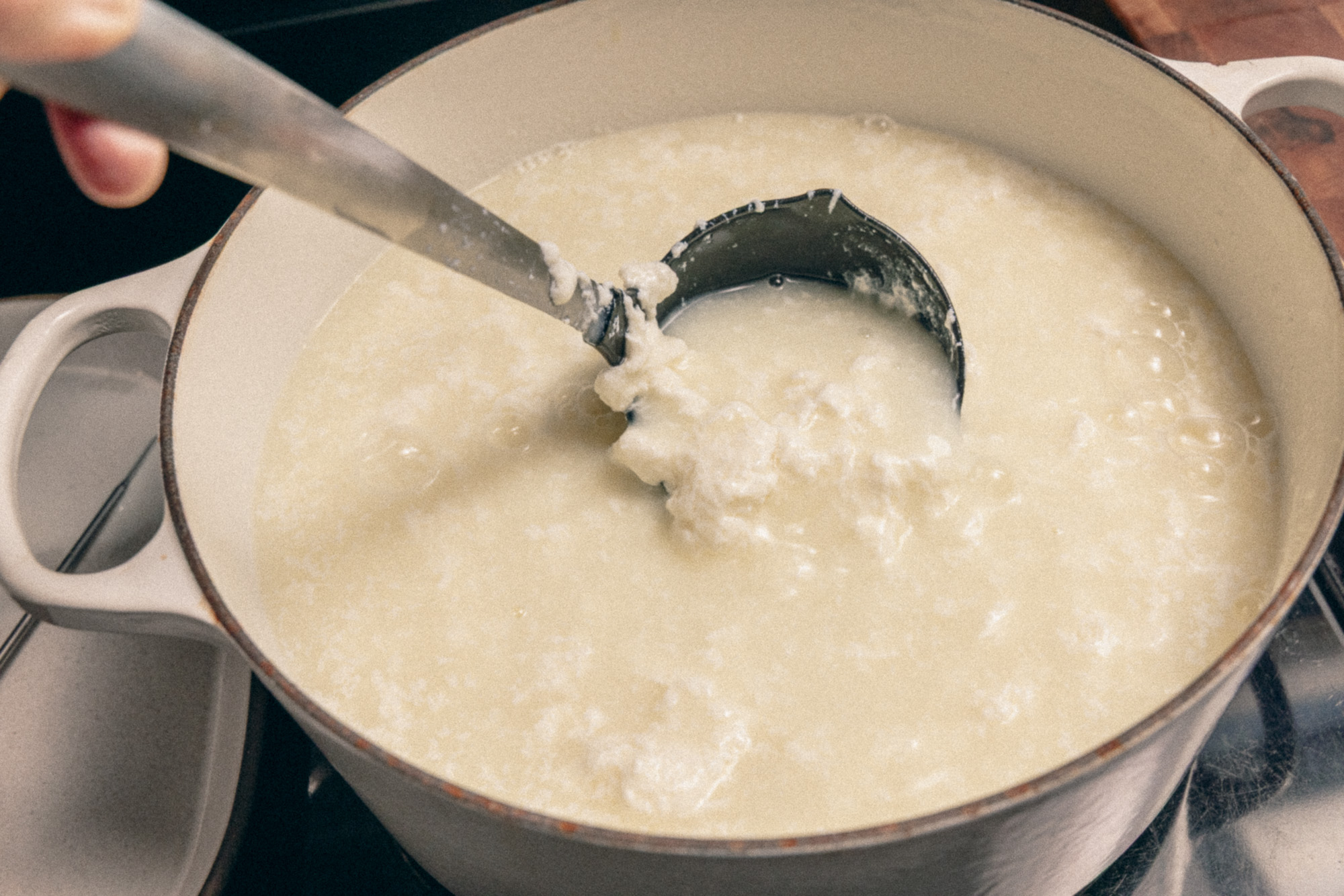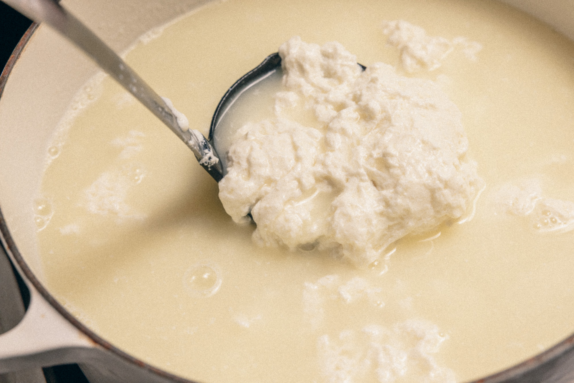 3. GATHER CURDS. With your spoon, gather and push all the curds together to one side of the pot. The curd will be like clumps of gum!