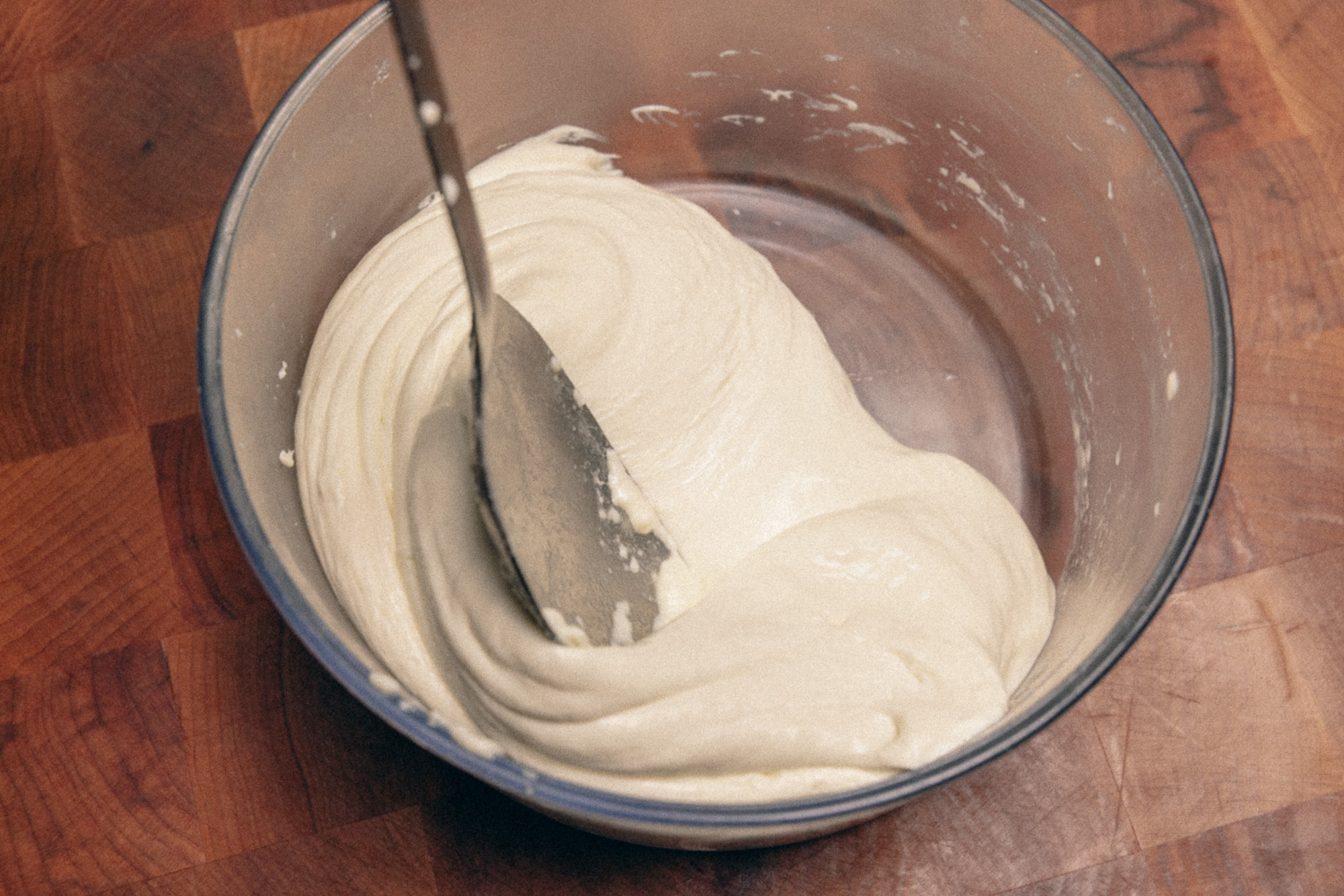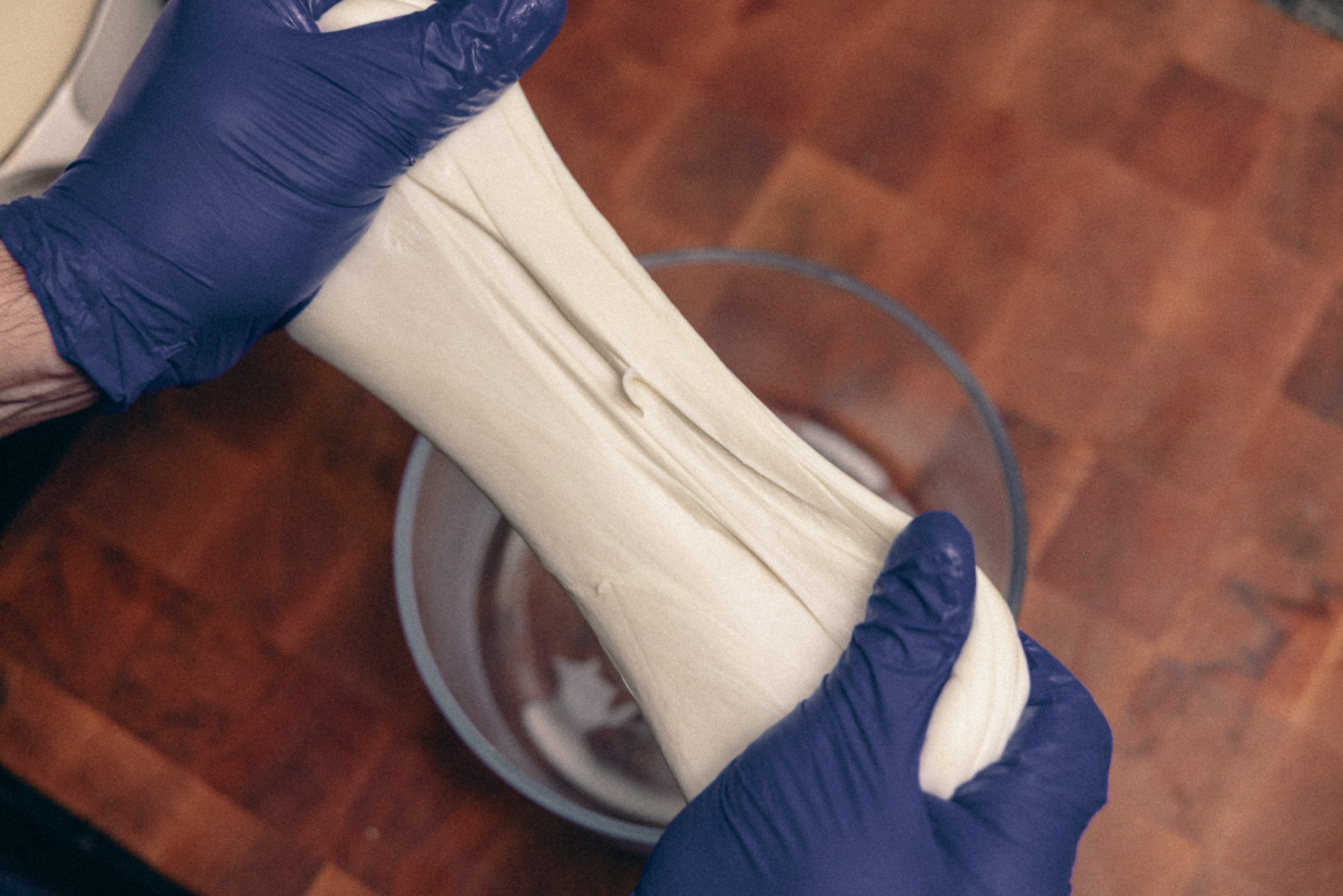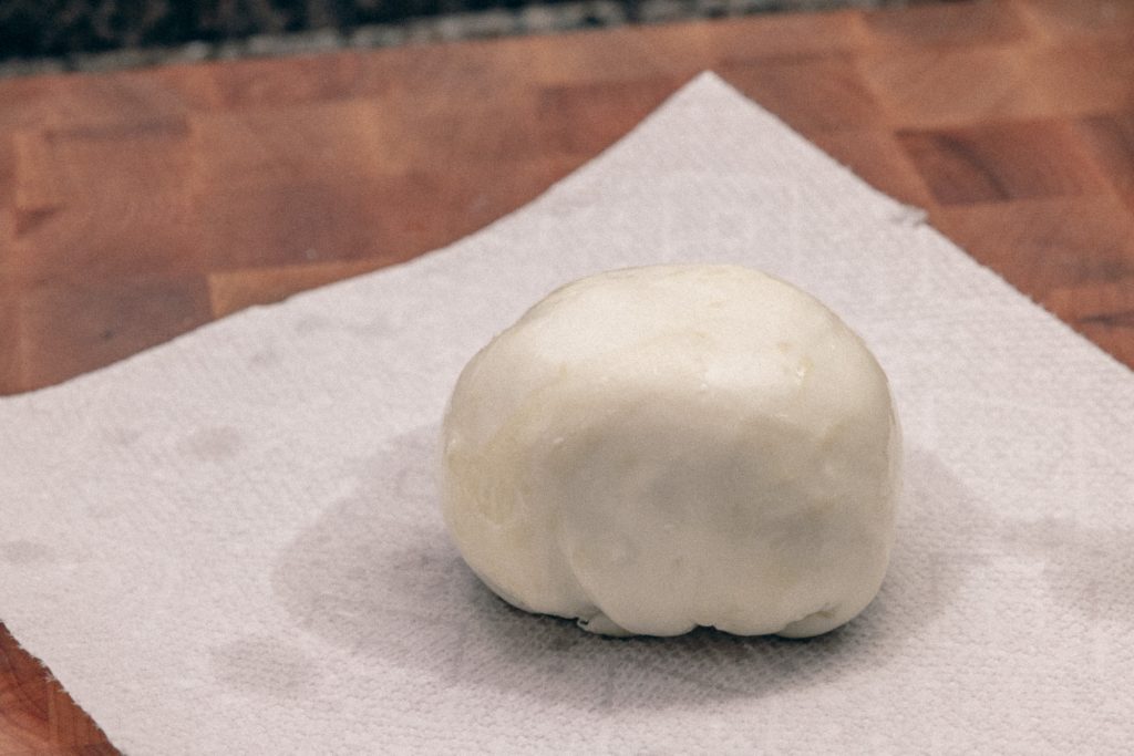7. STRETCH. Fold the cheese into itself multiple times. Use the spoon initially (if it’s too hot) and then your hands to stretch and fold. It should be like stretching a soft, giant gum.