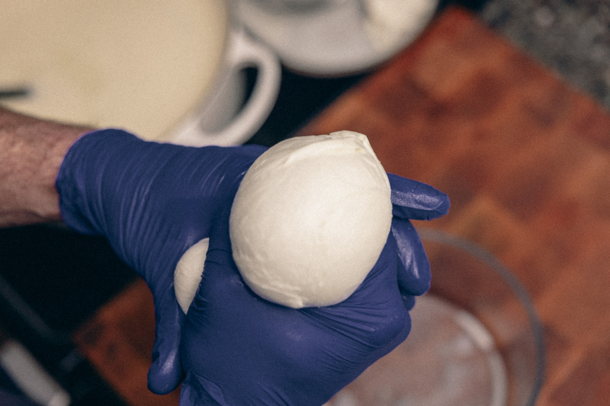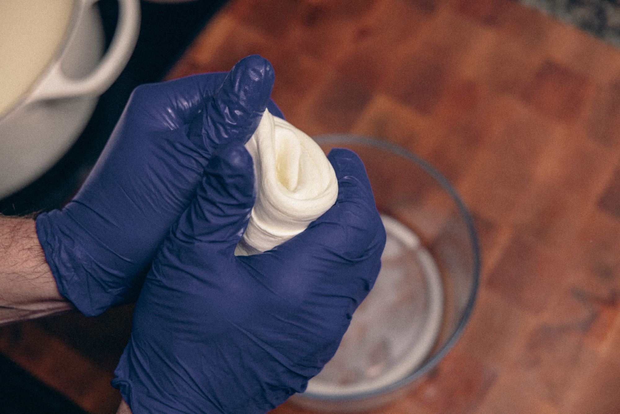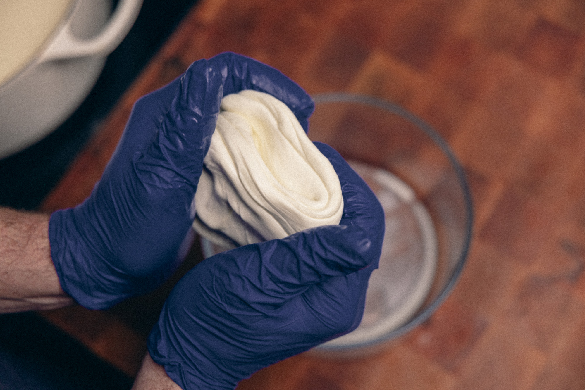 4. SQUEEZE. Spoon or ladle out the clump of curd and put it in a bowl. A microwave-safe bowl is easier. With clean hands or gloves on, squeeze the curds tight together and let extra whey fall back into the bowl or pot. You’ll want to squeeze out as much why as possible. In addition, the curds should be firm, not super soft.